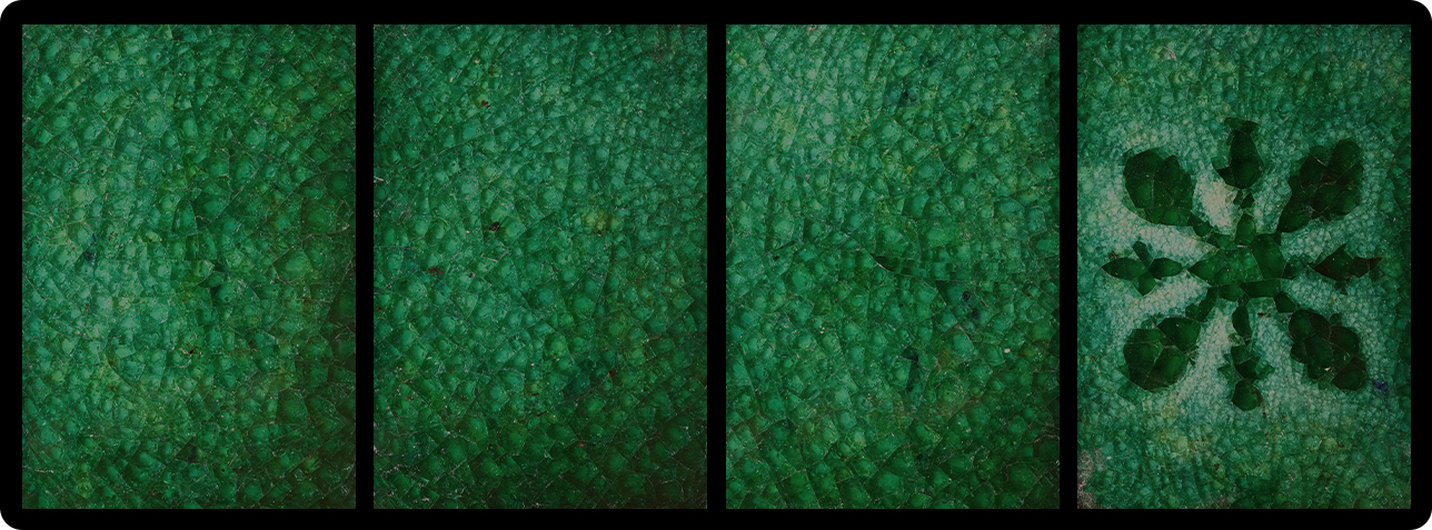 Each handmade tile features unique variations where emerald and jade greens blend in distinctive patterns, whilst the striking flower detail varies in placement across pieces. The rich, vibrant green palette brings a sense of life, renewal, and connection to nature. Borosilicate glass preserves these luminous emerald tones without fading, ensuring this memorial remains radiant for generations.