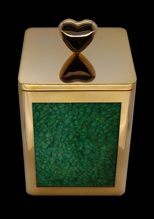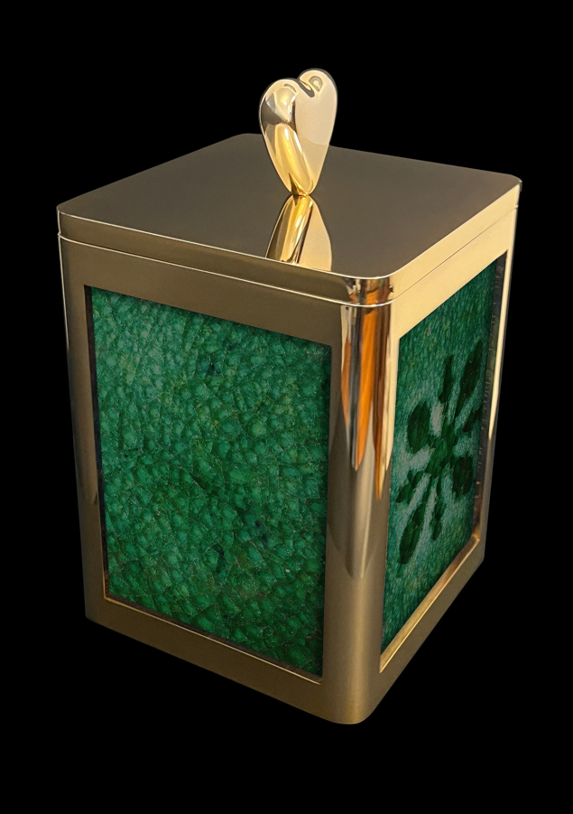 A divine memorial urn that elegantly pairs lustrous gold plating with handcrafted borosilicate glass tiles in rich emerald tones. Showcasing deep forest greens flowing through jade and verdant hues, creating a lush, nature-inspired aesthetic. A bold flower motif formed in deep emerald petals against a soft champagne background adds a powerful symbol of life, growth, and natural beauty. Crowned with an elegant heart finial, this piece embodies vitality and enduring love.