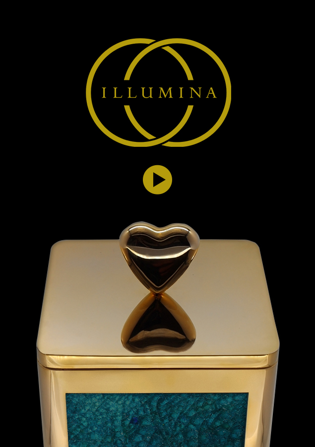A divine memorial urn that elegantly pairs lustrous gold plating with handcrafted borosilicate glass tiles in rich emerald tones. Showcasing deep forest greens flowing through jade and verdant hues, creating a lush, nature-inspired aesthetic. A bold flower motif formed in deep emerald petals against a soft champagne background adds a powerful symbol of life, growth, and natural beauty. Crowned with an elegant heart finial, this piece embodies vitality and enduring love.