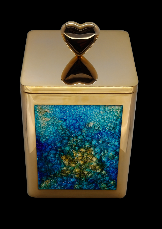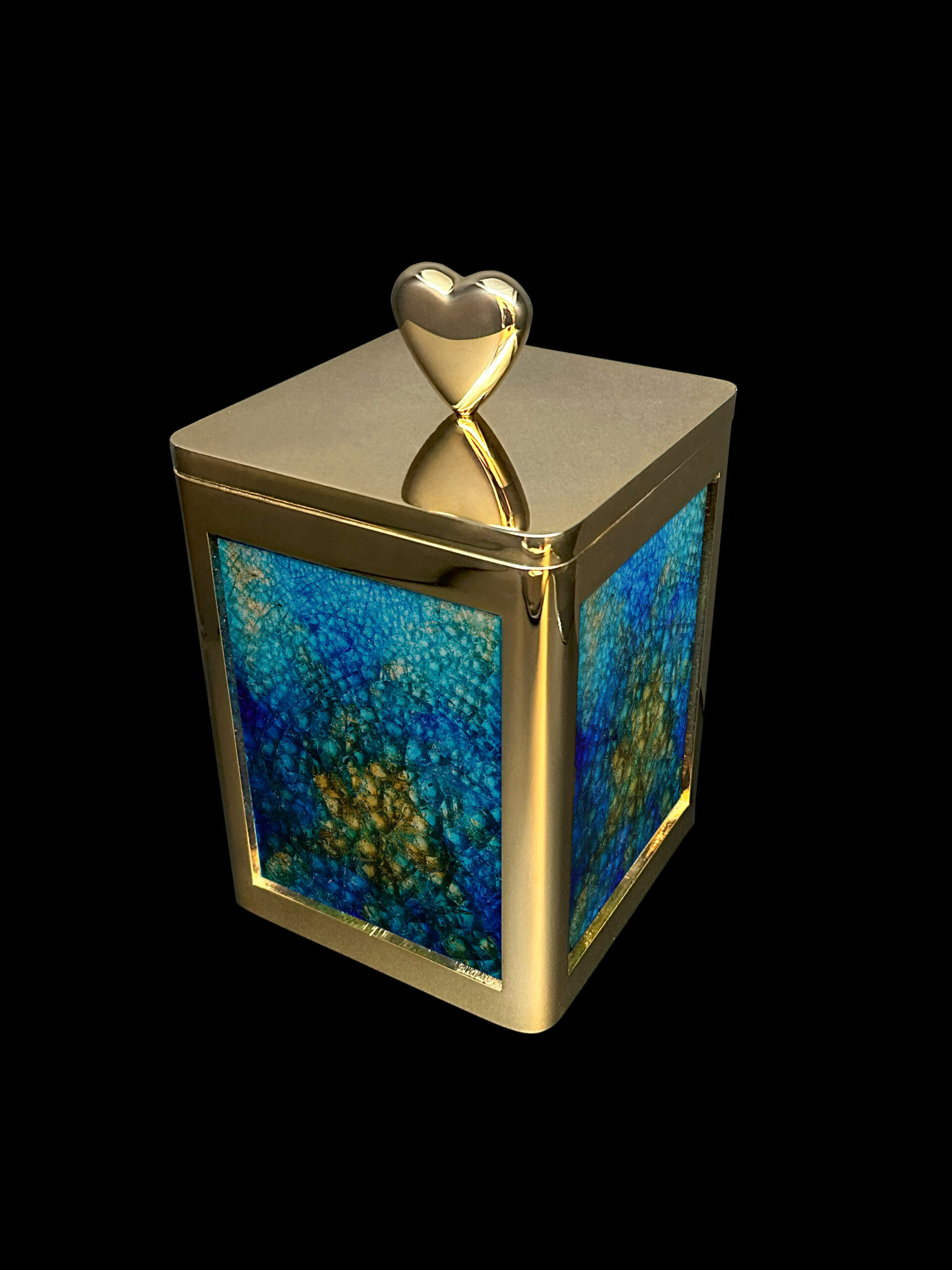 This small brass keepsake topped with a golden heart-shaped finial has iridescent deep blue glass panels representing the arrival of your loved one’s soul into heaven where it lies in peace. The iridescent blue also evokes memories of the joyous times that were shared together here on earth.